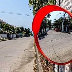 Wide-angle road mirrors for improved visibility at blind spots, ensuring safer navigation in parking spaces.
