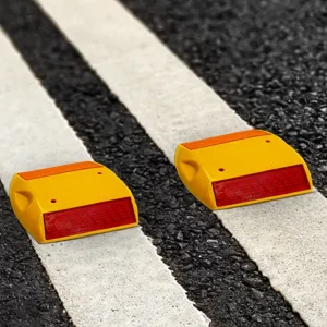 Highly reflective metal and plastic cateyes for improved visibility and road safety at night.